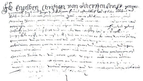 Ich Engelbert Christian von Scherffenberchk genant Pinninck thue kund zeuge und bekenne hiemit offentlich daß ich habe belehnet und belehne hiemit inkraft dieses breives Gerd Gerdes alß Ehenochten seiner haußfrawen Greten Jansen mit dem halben antheill wernekens Erbeß als ein new afterlehn mit aller darzu gehoriger alter und newer gerechtighkeitt geleich daßseibe in der baurschaft und marcke von Wahden Keßpels Soegel aller dinges belegen ist, im manß Statt: und im maßen er daßseibe von mir zu lehn empfangen, und deßen mit trew und hold zu sein und pleiben geschworen hatte geholdlichen demnach daran … meinem Erben und nachkomlingen, und jedermonnichlichen seines rechtens, daher mit mir an und über gewesen sein alß Heinrichen Bodige Not. und Jacob Cock. So geschehen auf meinem aldelichen Hause Scharffenborgh auf eynem außgeschriebenen Lehntagh am 26 tagh martii Anno 1686 urkund eigenen hand und angebohren adelichen pittschaft.