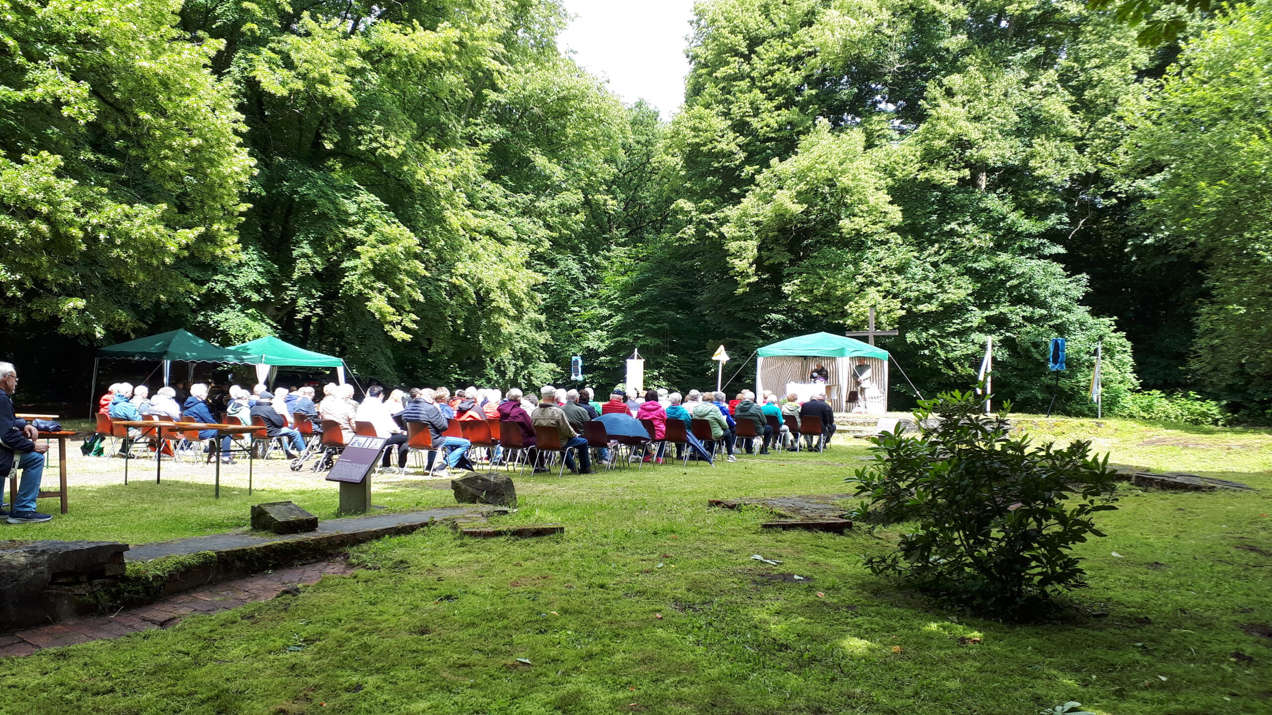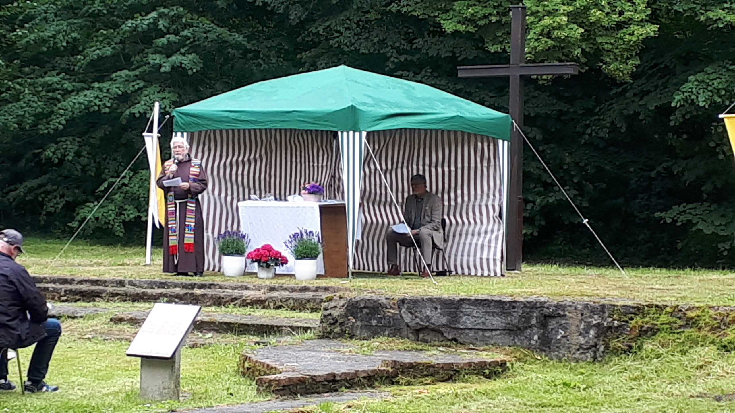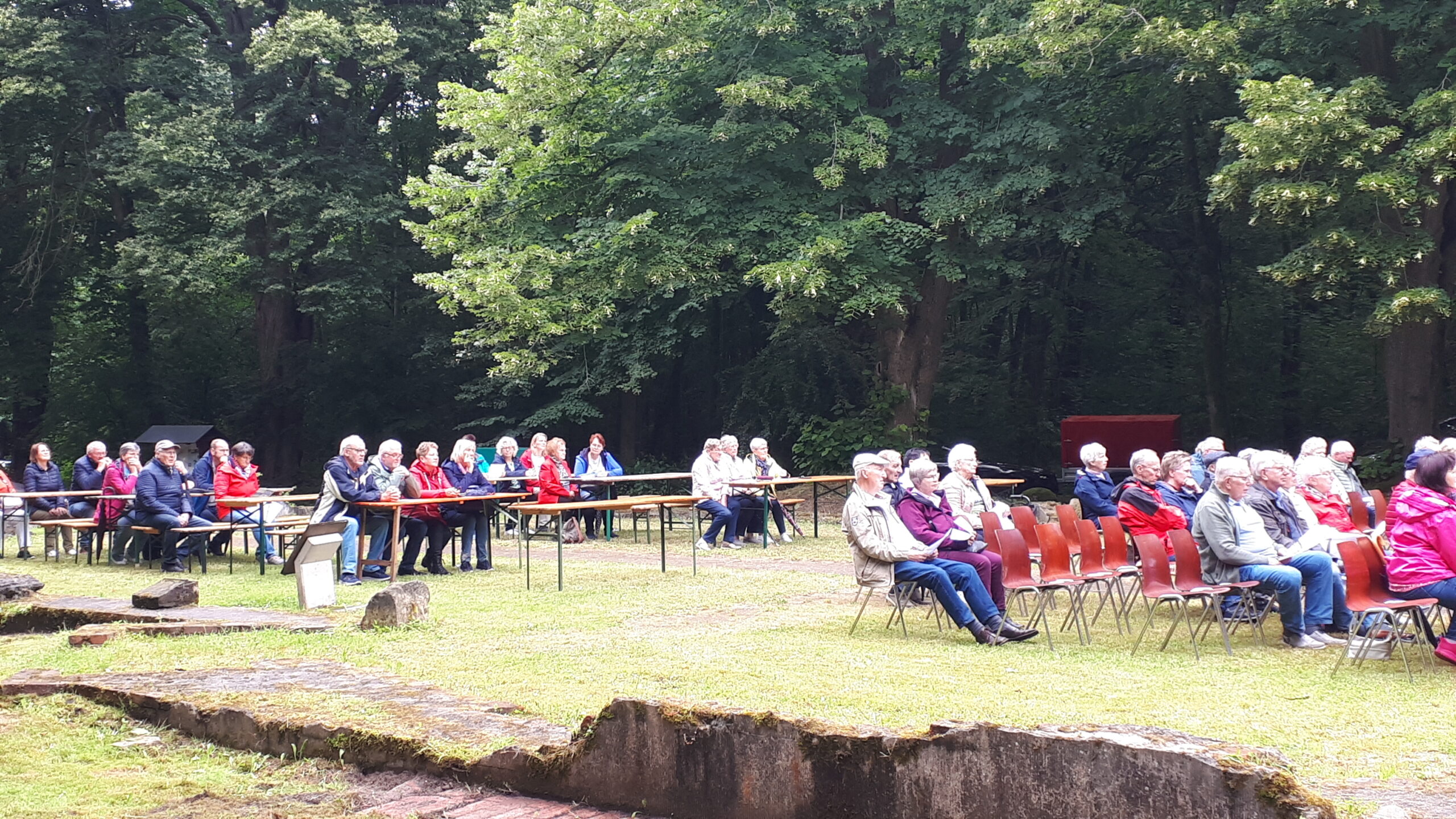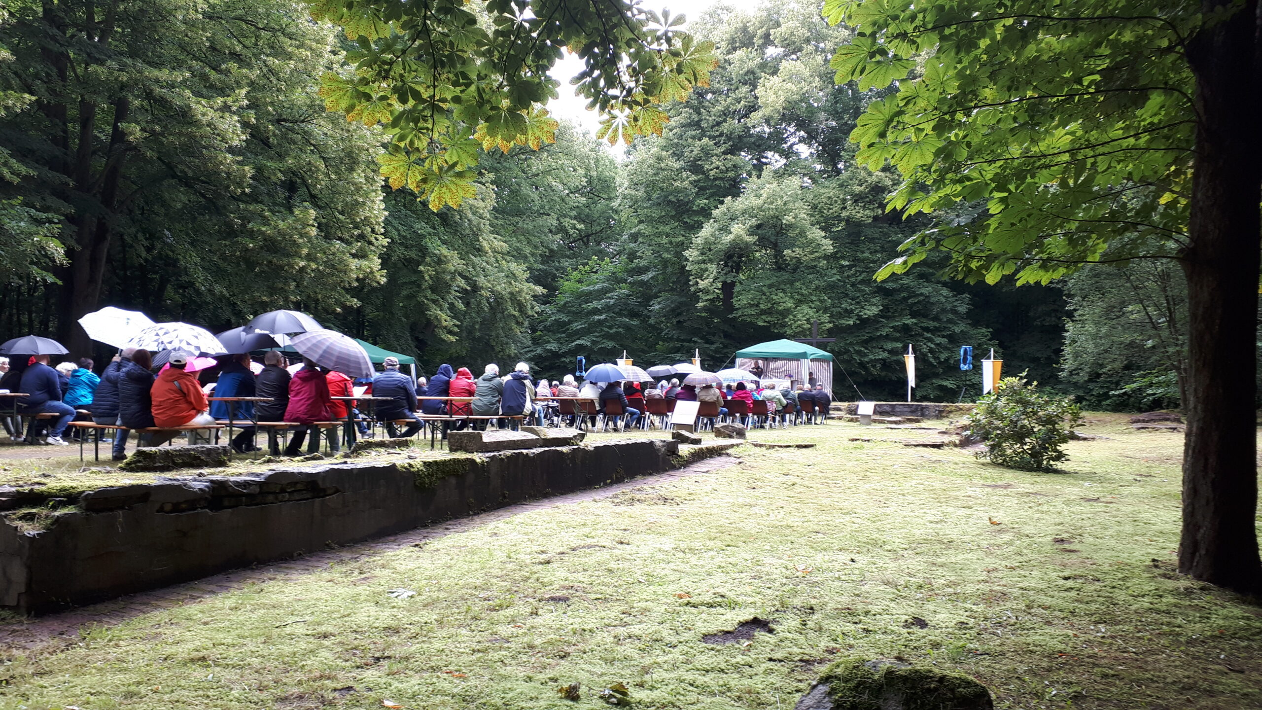 In den freigelegten Fundamenten der Kirche, dem sogenannten „Dom des Hümmlings“ trafen sich etwa 200 ehemalige Wahner, deren Nachkommen und natürlich viele Freunde und Gäste und besuchten die dort unter freiem Himmel stattfindende Heilige Messe. Ein kräftiger Regenguss zur Wandlung erschütterte die treuen Besucher nicht. Pater Edmund vom Kloster Clemenswerth in Sögel, der die Heilige Messe zelebrierte, fand einfühlsame Worte zur Flüchtlingslage in der Welt und natürlich für die besondere Fluchtsituation vor 82 Jahren, als die letzten Wahner ihr Dorf verlassen mussten.