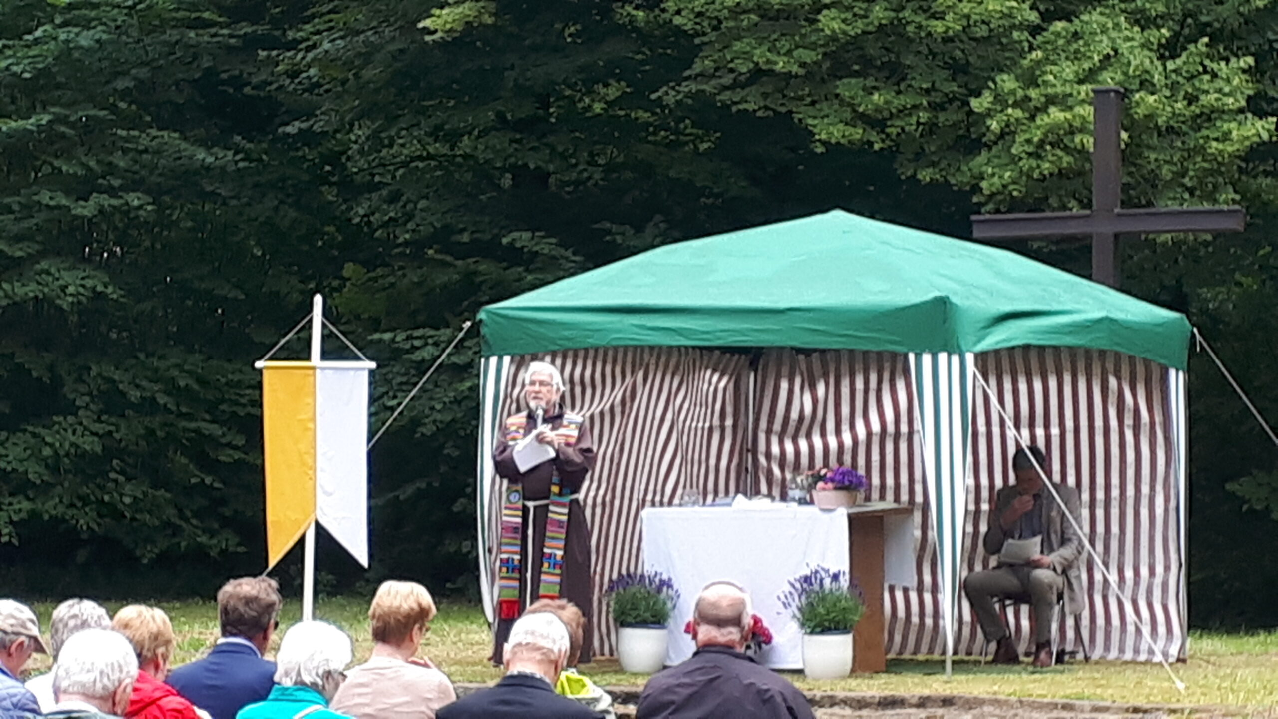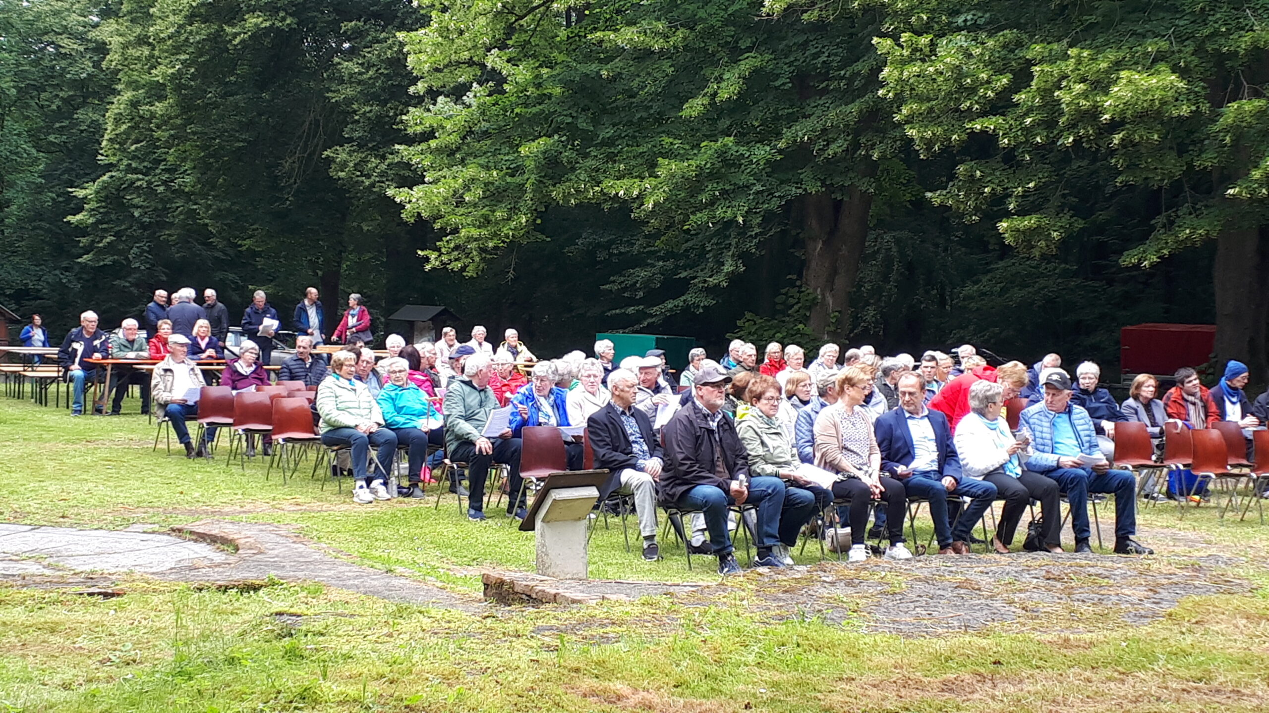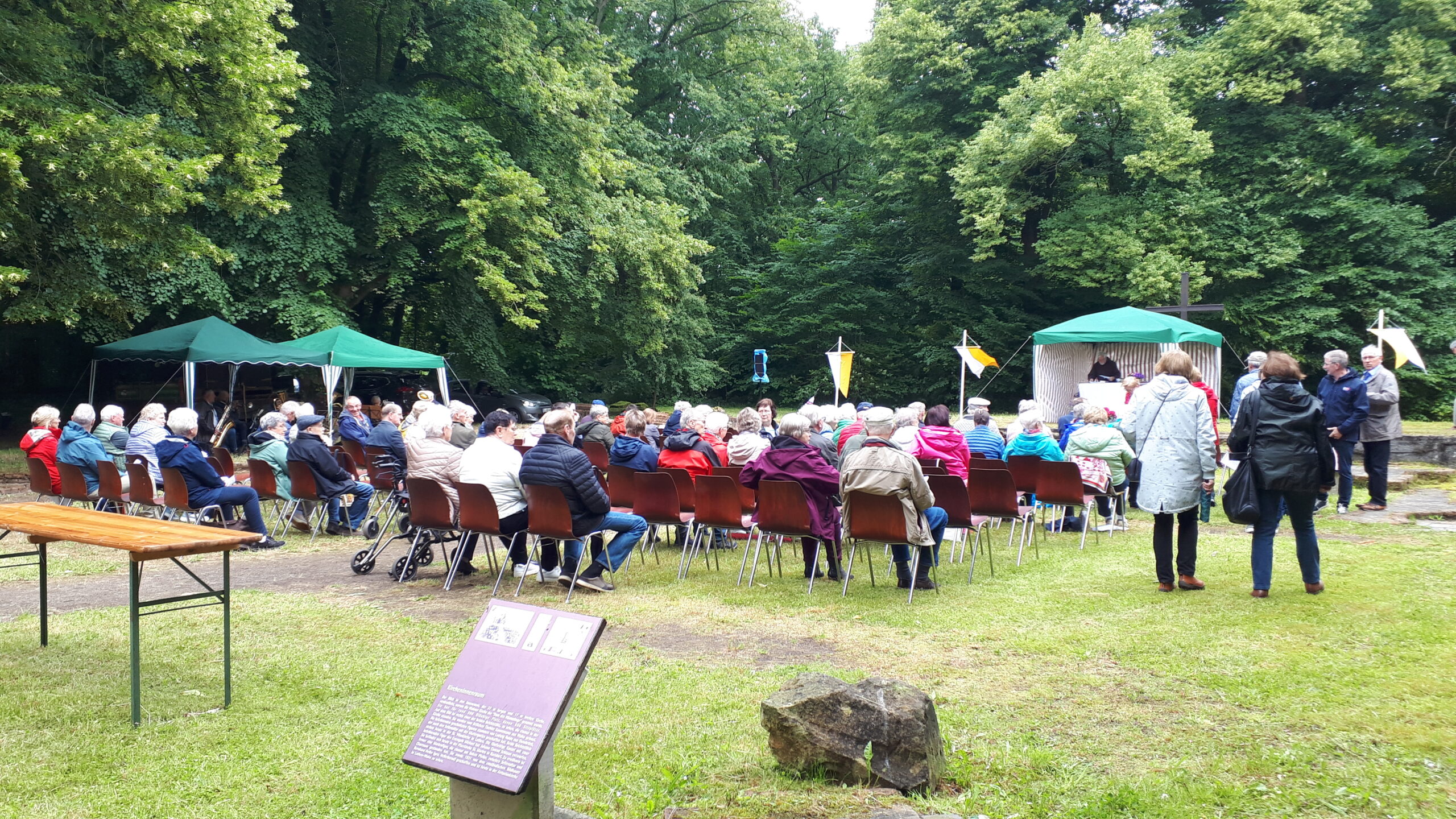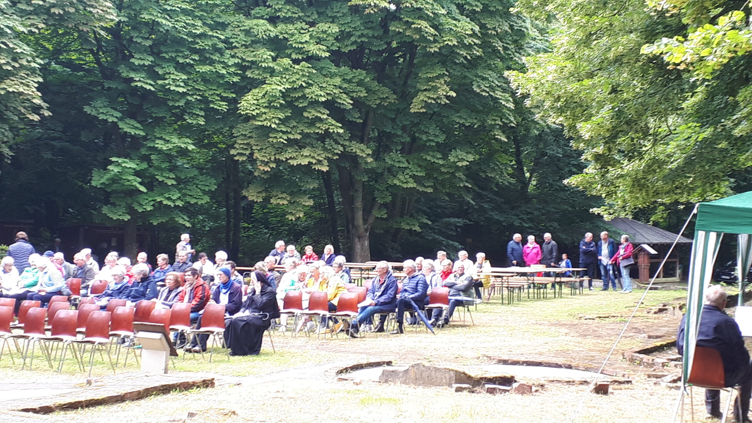In den freigelegten Fundamenten der Kirche, dem sogenannten „Dom des Hümmlings“ trafen sich etwa 200 ehemalige Wahner, deren Nachkommen und natürlich viele Freunde und Gäste und besuchten die dort unter freiem Himmel stattfindende Heilige Messe. Ein kräftiger Regenguss zur Wandlung erschütterte die treuen Besucher nicht. Pater Edmund vom Kloster Clemenswerth in Sögel, der die Heilige Messe zelebrierte, fand einfühlsame Worte zur Flüchtlingslage in der Welt und natürlich für die besondere Fluchtsituation vor 82 Jahren, als die letzten Wahner ihr Dorf verlassen mussten.