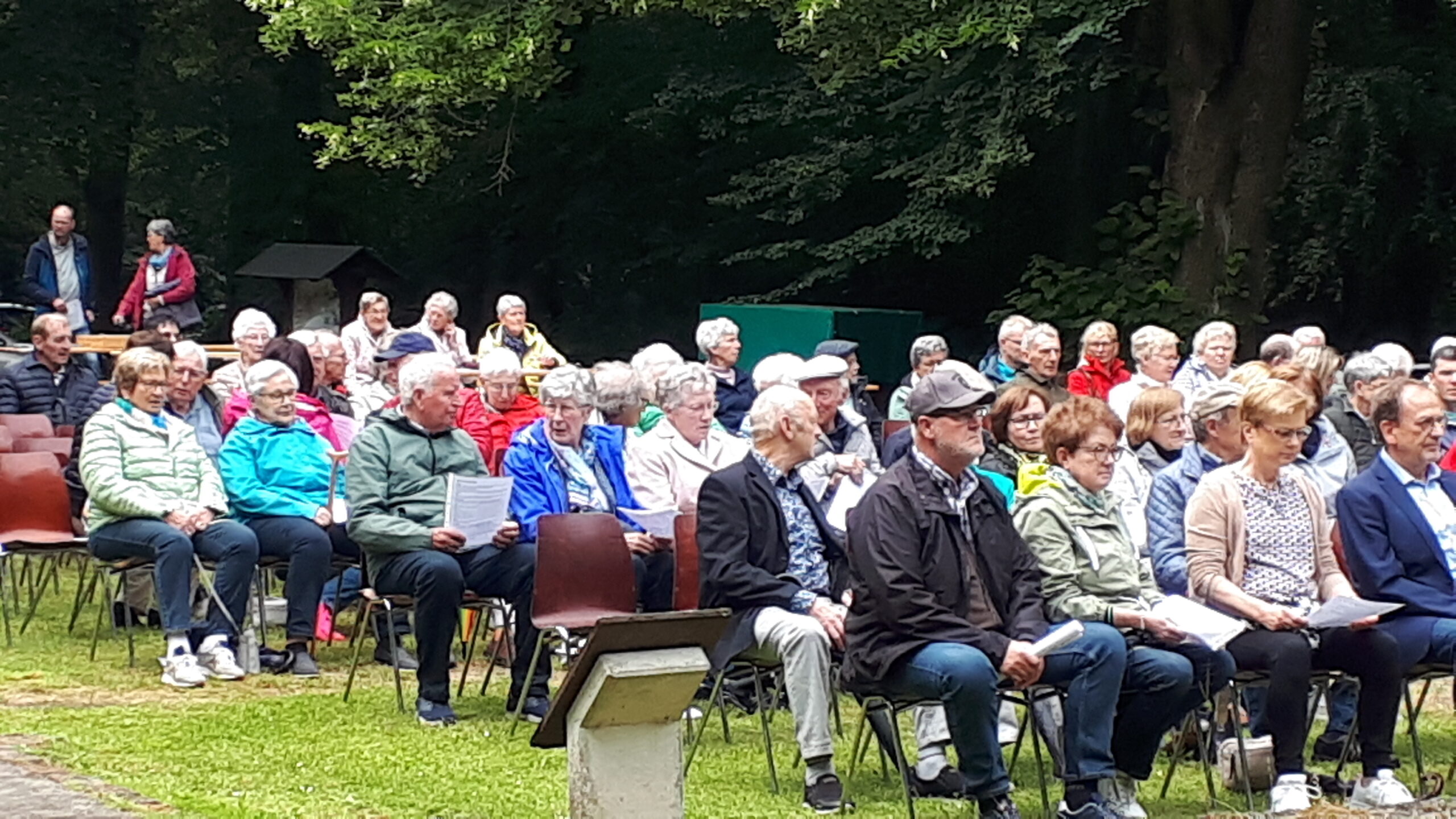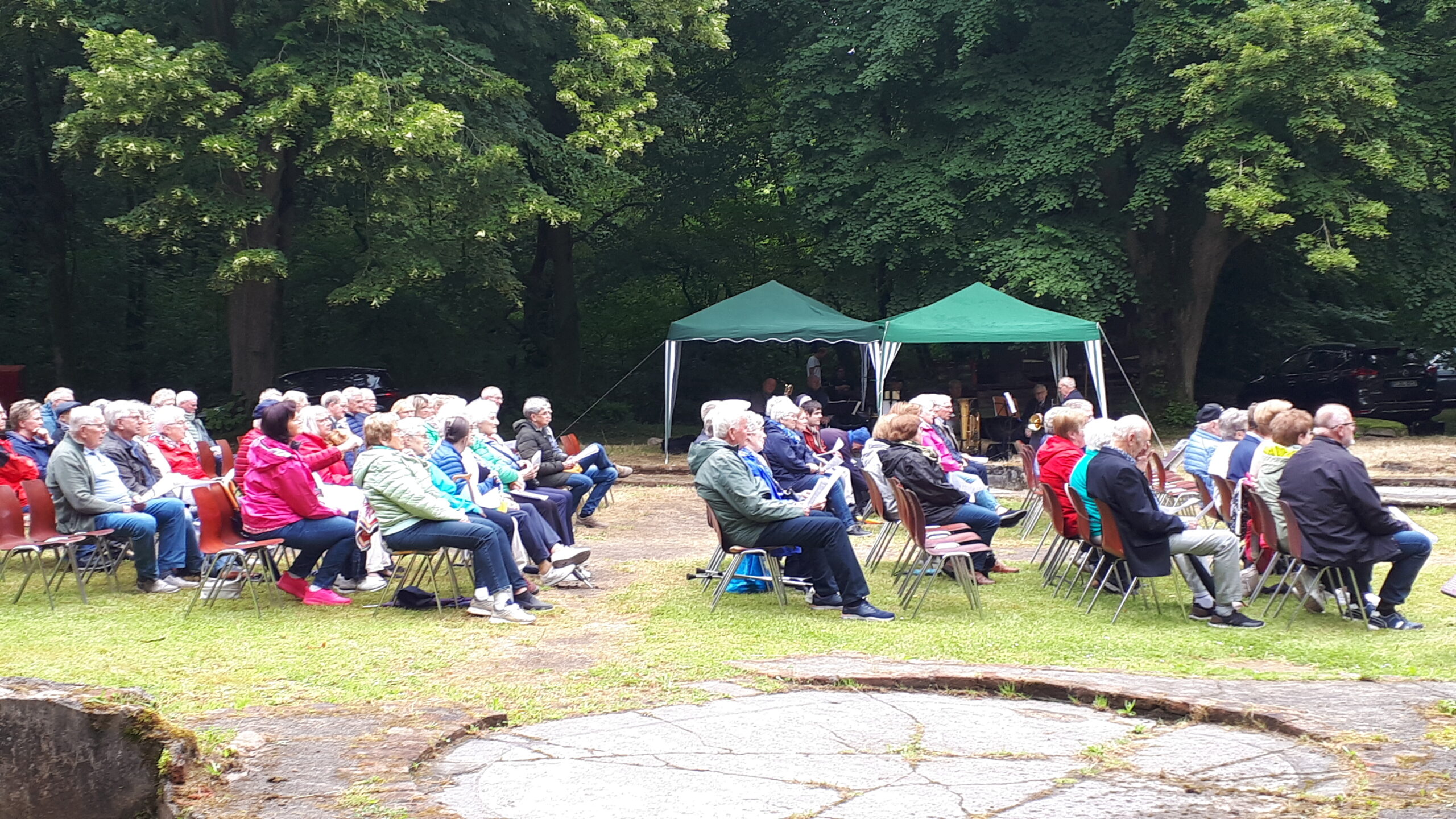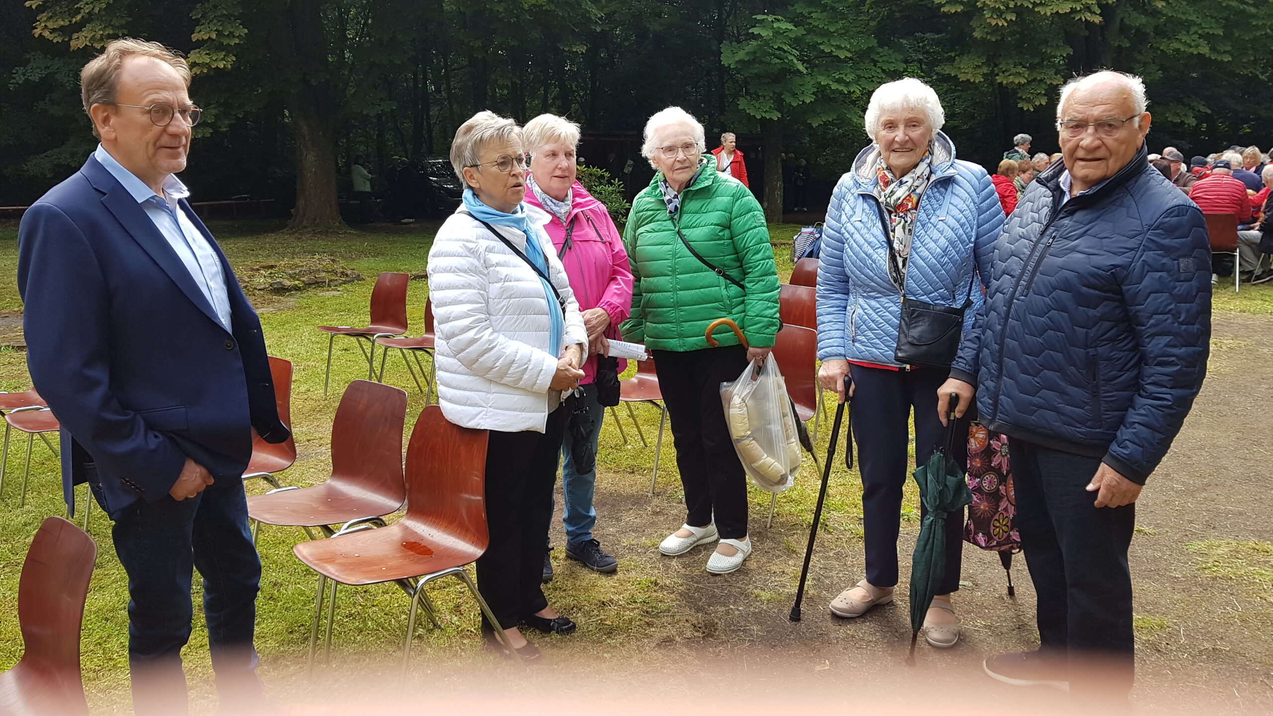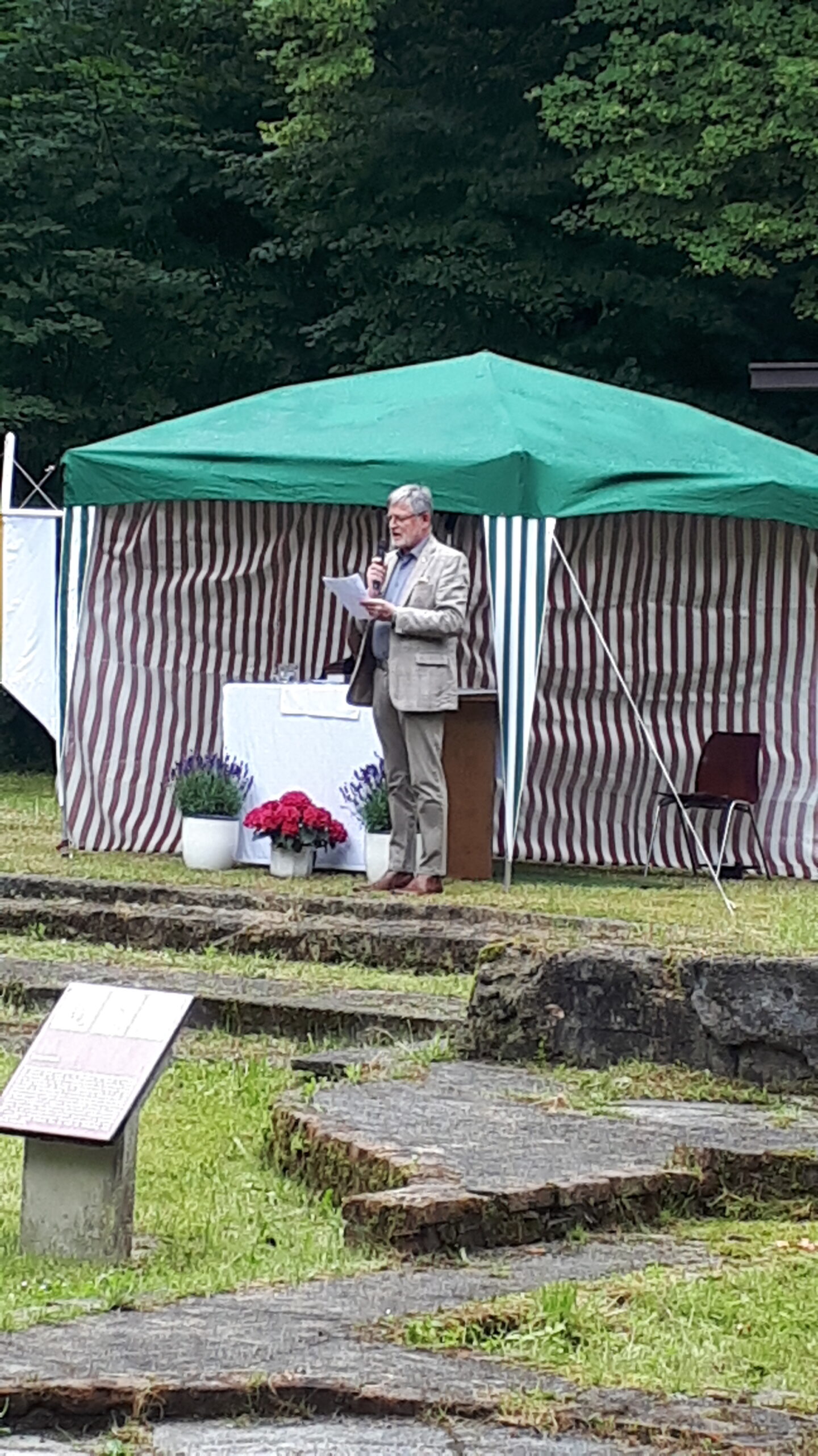 In den freigelegten Fundamenten der Kirche, dem sogenannten „Dom des Hümmlings“ trafen sich etwa 200 ehemalige Wahner, deren Nachkommen und natürlich viele Freunde und Gäste und besuchten die dort unter freiem Himmel stattfindende Heilige Messe. Ein kräftiger Regenguss zur Wandlung erschütterte die treuen Besucher nicht. Pater Edmund vom Kloster Clemenswerth in Sögel, der die Heilige Messe zelebrierte, fand einfühlsame Worte zur Flüchtlingslage in der Welt und natürlich für die besondere Fluchtsituation vor 82 Jahren, als die letzten Wahner ihr Dorf verlassen mussten.